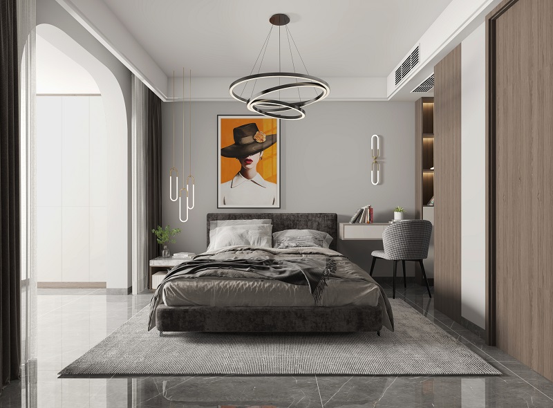 臥室以灰色為主,深灰的布藝大床上方布置了極具藝術(shù)感的吊燈,再搭配上左側(cè)現(xiàn)代時尚、金屬質(zhì)感的床頭燈,輕奢感十足。橙色的壁畫減少沉悶感,使整個空間更加愜意。