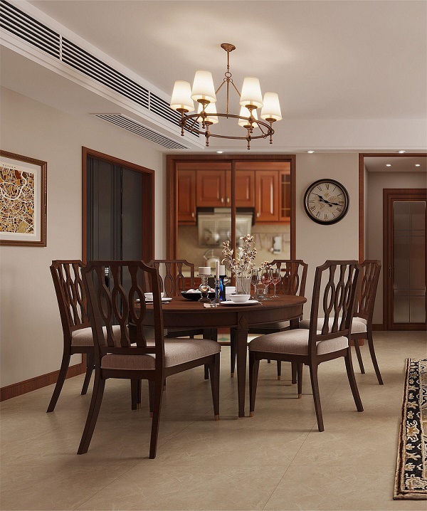 餐廳內(nèi)的桌椅、時(shí)鐘、裝飾畫都選用了深色的木質(zhì)材質(zhì),賦予空間高雅、尊貴的氣息。展現(xiàn)出中式文化的傳統(tǒng)魅力。