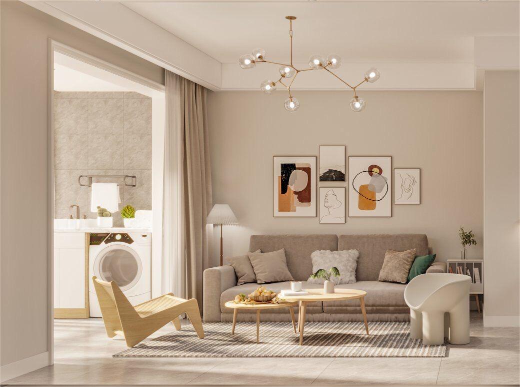 客廳整體為暖白色調(diào),淺色的沙發(fā)、簡(jiǎn)約的茶幾共同營(yíng)造出一個(gè)輕松自然的氛圍。沙發(fā)墻的抽象幾何掛畫(huà)以及富有創(chuàng)意感的的吊燈顯得更加有藝術(shù)氣息;整體呈現(xiàn)出舒適愜意的環(huán)境