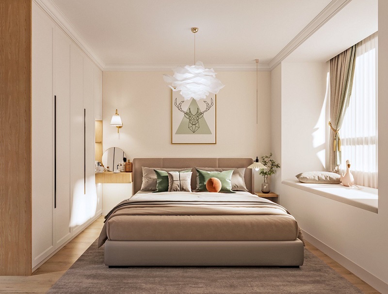 臥室沿用暖白色作為主色調(diào)。右側(cè)的飄窗設(shè)置成休息區(qū),增強(qiáng)空間使用性且不影響采光。綠植枕頭和裝飾畫(huà)的綠色點(diǎn)綴,為房間增添更多的吸感,也使整個(gè)空間更加生機(jī)勃勃。