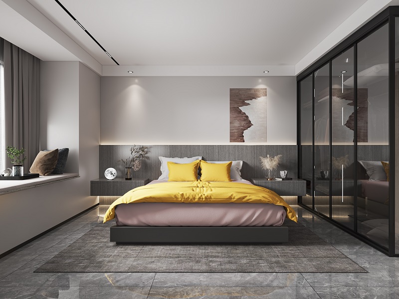 臥室采用灰色為主色調(diào),點(diǎn)綴明黃色作為亮色在平靜的背景下,營造輕松、溫暖的氛圍。