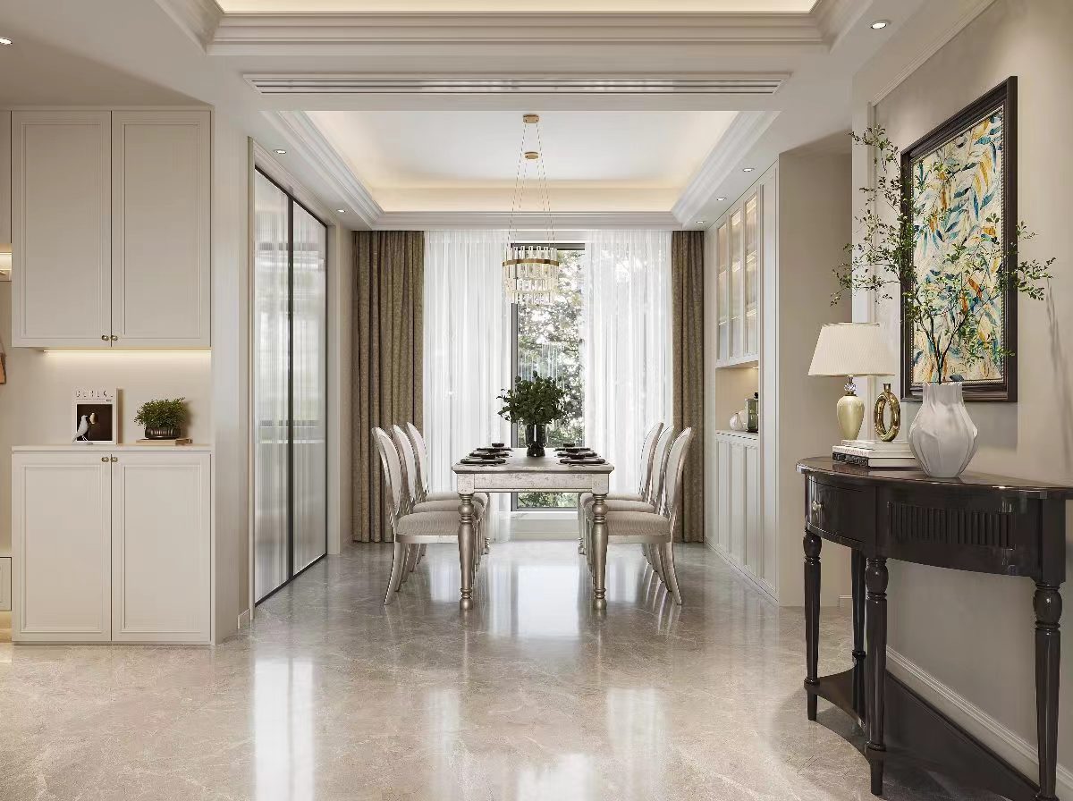 吊燈以透明水晶為主,適量點(diǎn)綴金屬元素,從富有層次感的天花板上懸掛而下,減少空間壓迫感的同時(shí)將柔和的燈光小范圍地灑落餐桌上方,映照著桌上的綠植,散發(fā)著別樣的生機(jī)與活力。側(cè)邊的落地窗宛如一幅天然的畫卷,既增加了空間的通透性,又是居者用餐時(shí)的絕佳陪伴。泛有金屬色澤的餐桌椅進(jìn)一步增添高貴質(zhì)感,羅馬柱設(shè)計(jì)的桌角在細(xì)節(jié)處提升空間精致度,讓居者感受到那份源自精心雕琢的輕奢魅力。